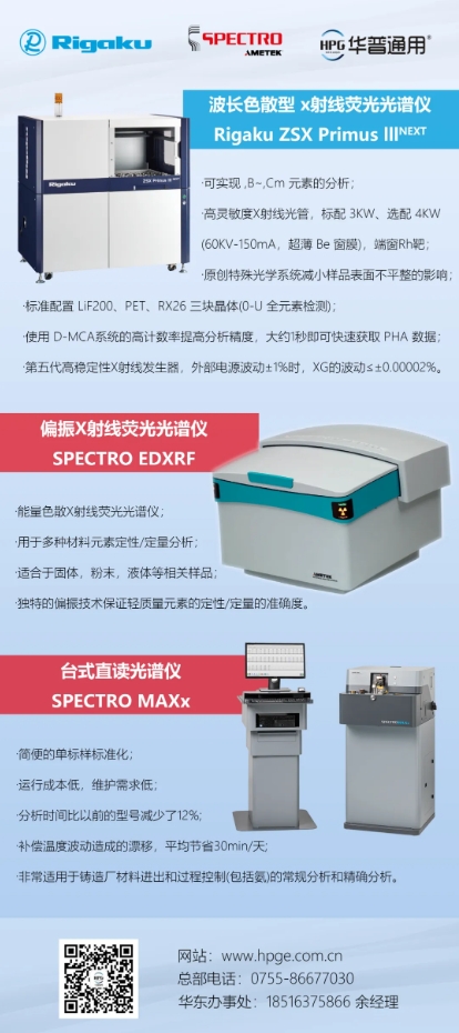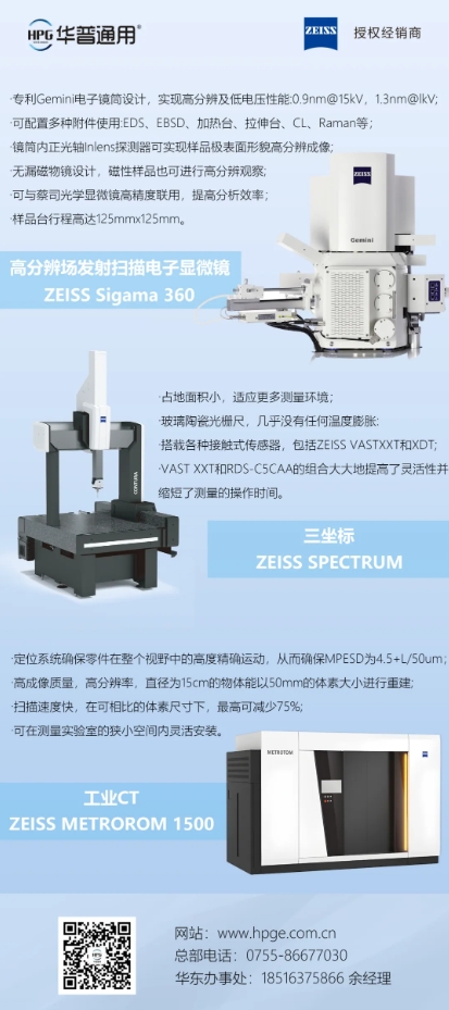 設(shè)備介紹包括但不限于德國蔡司高分辨場發(fā)射掃描電子顯微鏡Sigma360、三坐標(biāo)SPECTRUM、工業(yè)CT METROTOM 1500;德國斯派克偏振X射線熒光光譜儀EDXRF、臺式直讀光譜儀MAXx;日本理學(xué)波長色散型X射線熒光光譜儀 ZSX Primus IIInext